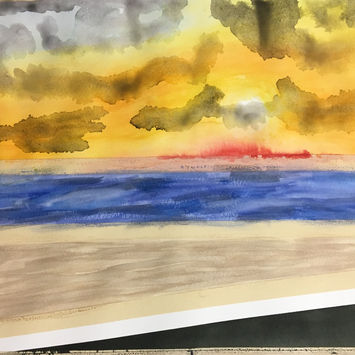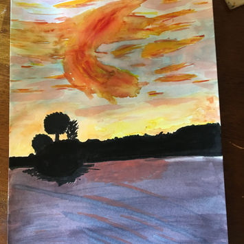 This painting was painted with watercolor. A variety of techniques were used such as wet on wet, dry brush, and splatter. The grass is layered with a variety of greens and browns. Also the sunset is blended with clouds that pop at the eye.